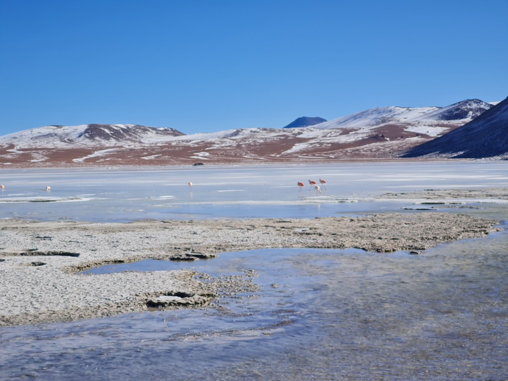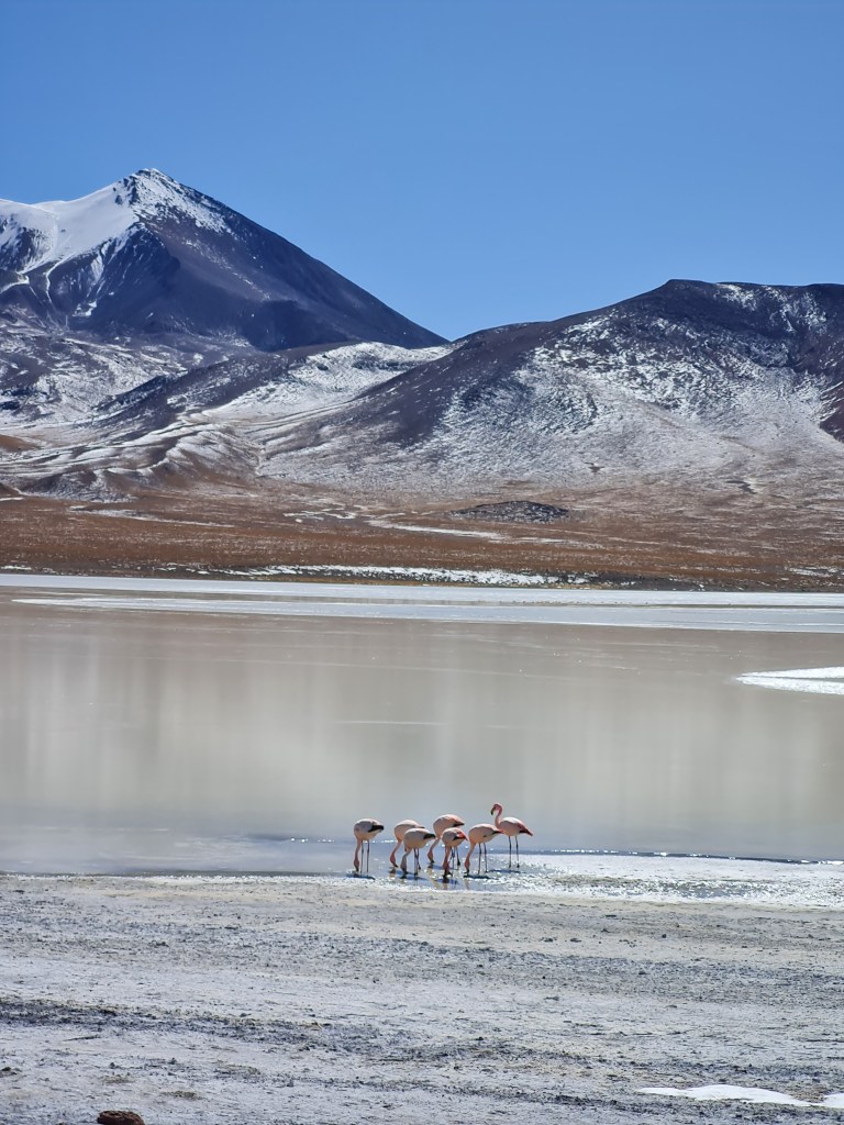 A primeira lagoa que visitamos foi a Laguna Chulluncani, a cerca de 20 minutos do Vale de La Roca, rodeada por vulcões inativos com neve no topo. Ela estava congelada, mas com patinhos e flamingos. Muito frio!