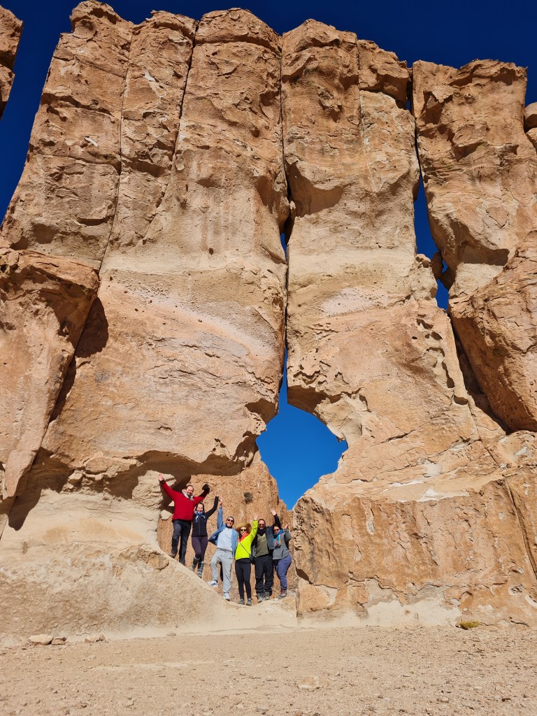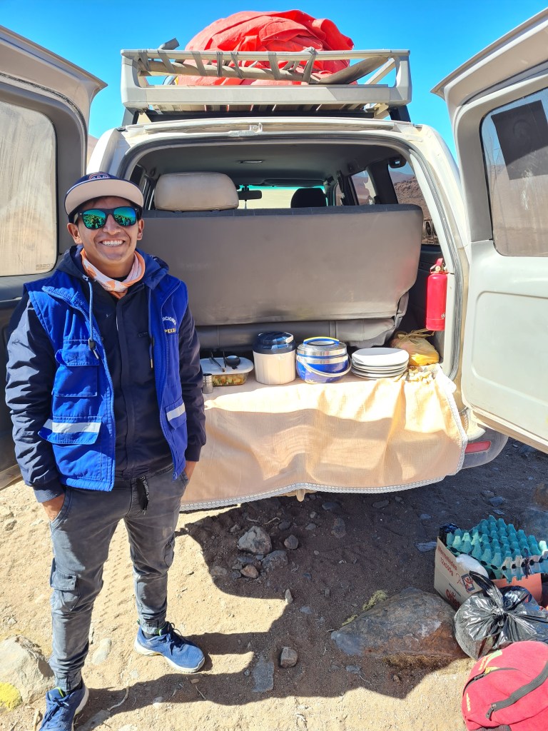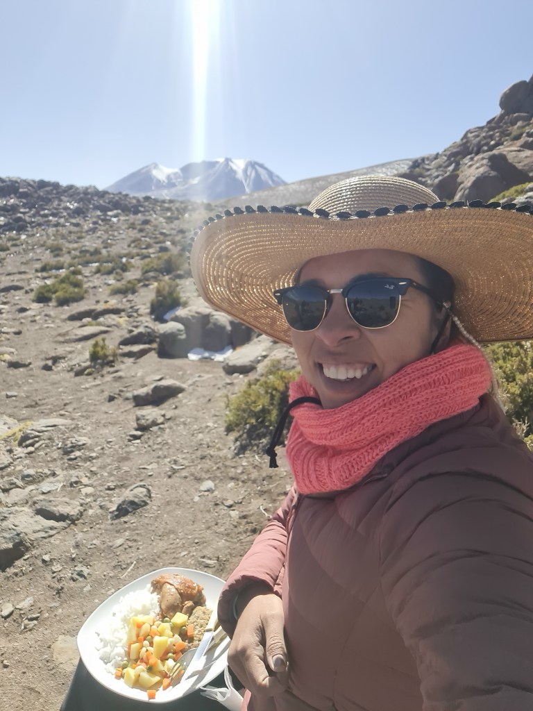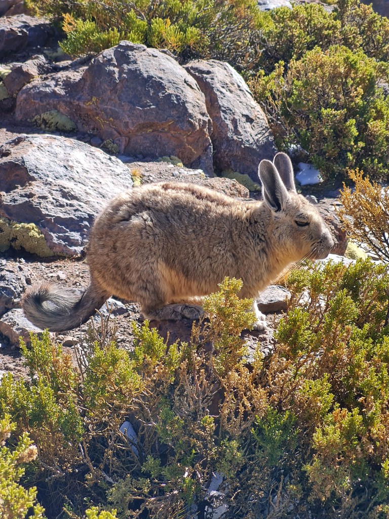 O almoço do segundo dia foi no meio do deserto, onde comemos sentados nas rochas na companhia de vizcachas (coelhos com um rabo grande, como uma mistura de coelho com kanguru). As rochas nos protegeram do frio, então foi um almoço muito agradável! O cardápio foi frango, arroz, legumes e o omelete que sobrou do menu vegetariano da Ana.