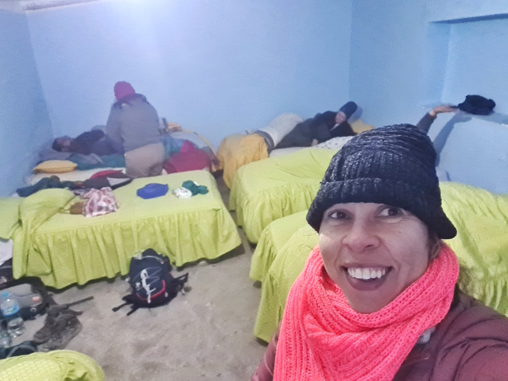 Dormi muito bem, apesar de, no começo, ter sentido dificuldade para respirar (acho que pela pressão da altitude e pelo frio; era como se os cobertores fossem muito pesados) e de ter ficado com nariz entupido. Meus companheiros de quarto ficaram impressionados como eu consegui dormir, pois ninguém mais conseguiu, seja pelo frio, seja pelo barulho dos outros. Sou “boa de cama”! ahhahah
