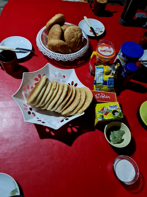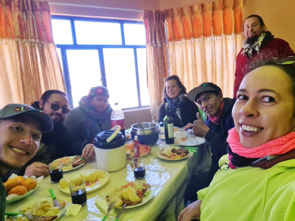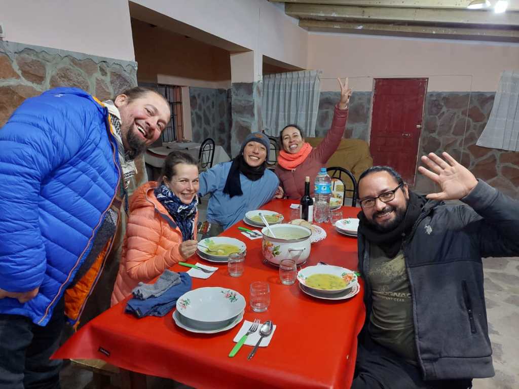 Depois da parada na Laguna, fomos para o nosso alojamento, que fica dentro do parque. Ele é bem simples, sem calefação e sem água quente! Então, sem condições de tomar banho. Não existe quarto privativo, apenas dormitórios, de modo que dormimos os seis juntos, num quarto bem gelado. O lugar menos frio do alojamento era o refeitório, onde fomos recebidos com bebidas quentes, biscoitinhos e, em seguida, o jantar: uma deliciosa sopa de milho com legumes de entrada e espaguete com carne de llama ao molho sugo e queijo de cabra ralado. Aproveitamos a água quente da garrafa térmica para escovar os dentes e lavar o rosto!