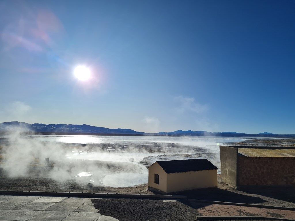 De lá seguimos, por mais uns 40 minutos, até as Águas Termais de Polques, onde existem duas piscinas de água natural (nascente) e quente, sendo uma com 25°C e outra com 35° C. A entrada é paga e custa 6 Bo (R$ 4,50) e paguei mais 10 Bo (R$7,50) pelo aluguel da toalha. O lugar é bem simples. Tem um vestiário (sem banheiro) perto da piscina, onde troquei de roupa e saí correndo (o frio estava grande) direto para a piscina de 35°C. Pela primeira vez, após várias horas, estava bem aquecida! Não queria mais sair de lá! Tinha medo de sair da água, mas até que foi de boa. Impressionante como aquele banho conseguiu manter meu corpo aquecido.