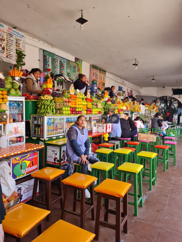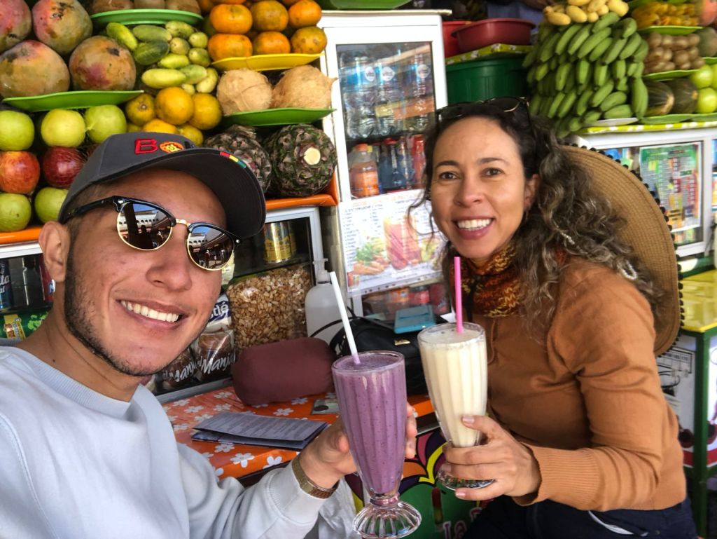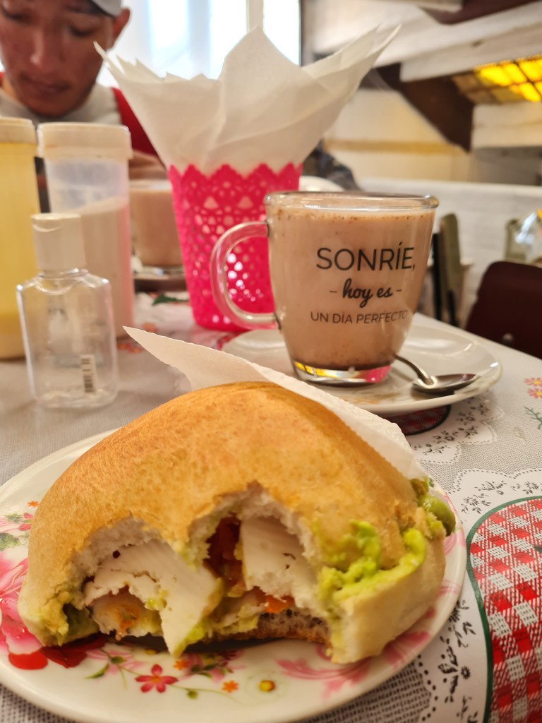 Descansados, começamos nosso tour pela cidade. A primeira parada foi no Mercado Central, onde tomamos um belo café da manhã: típico, gostoso e barato! Fomos primeiro para o segundo andar, onde ficam os “comedores”, quiosques que servem café da manhã e almoço. Escolhemos o mais movimentado e pedimos um sanduíche de abacate com ovo, queijo e tomate e um chocolate quente. Descemos para o térreo, onde ficam as frutas e tomamos deliciosas vitaminas, com direito a “chorinho” (yapa). Tudo delicioso! A ideia era comer uma salteña na famosa Salteñeria El Patio, mas não cabia mais.