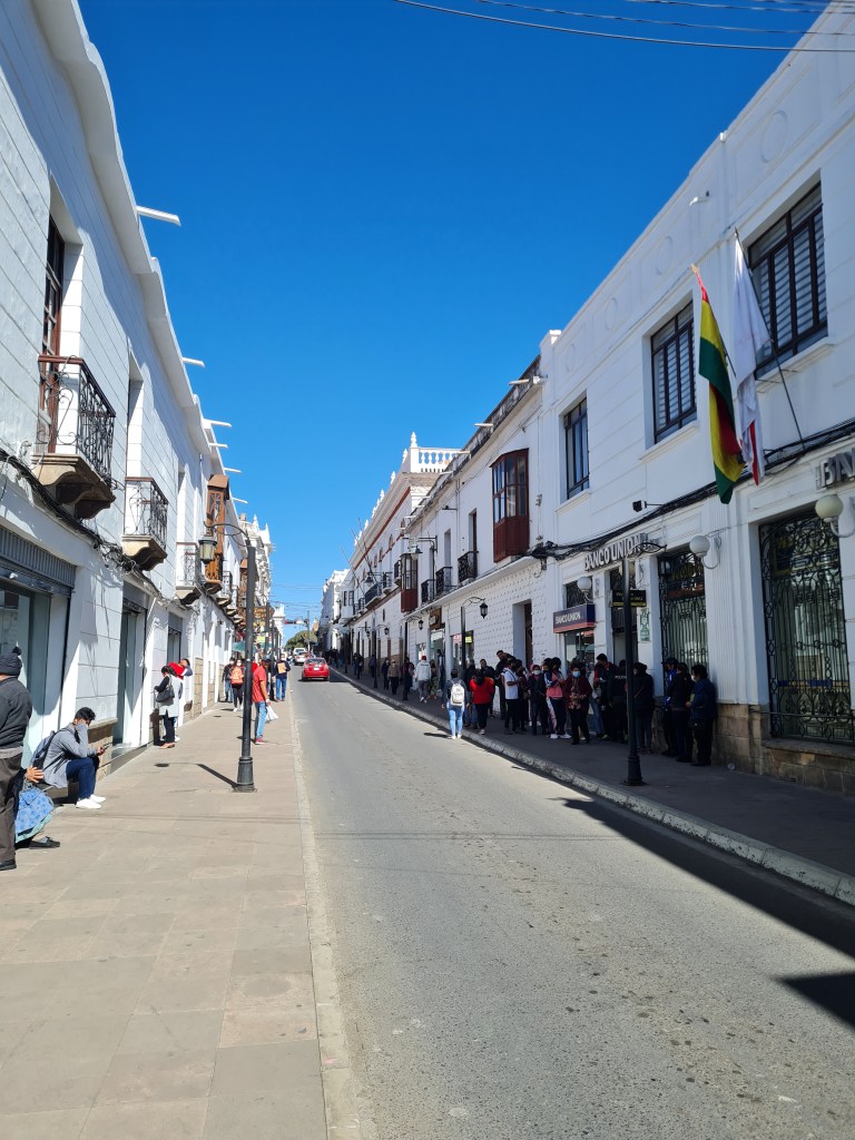 Antes de seguir para as demais atrações turísticas, resolvermos trocar dinheiro, o que foi uma novela. As casas de câmbio de Sucre só trocam notas de 100 dólares, as menores só em bancos. Ali pertinho, na rua Espanha, tem um monte de bancos,inclusive o Banco Nacional da Bolívia, mas a maioria estava com filas gigantes. Encontramos um com menos fila e, após muita burocracia, conseguimos trocar, porém com uma cotação mais baixa.