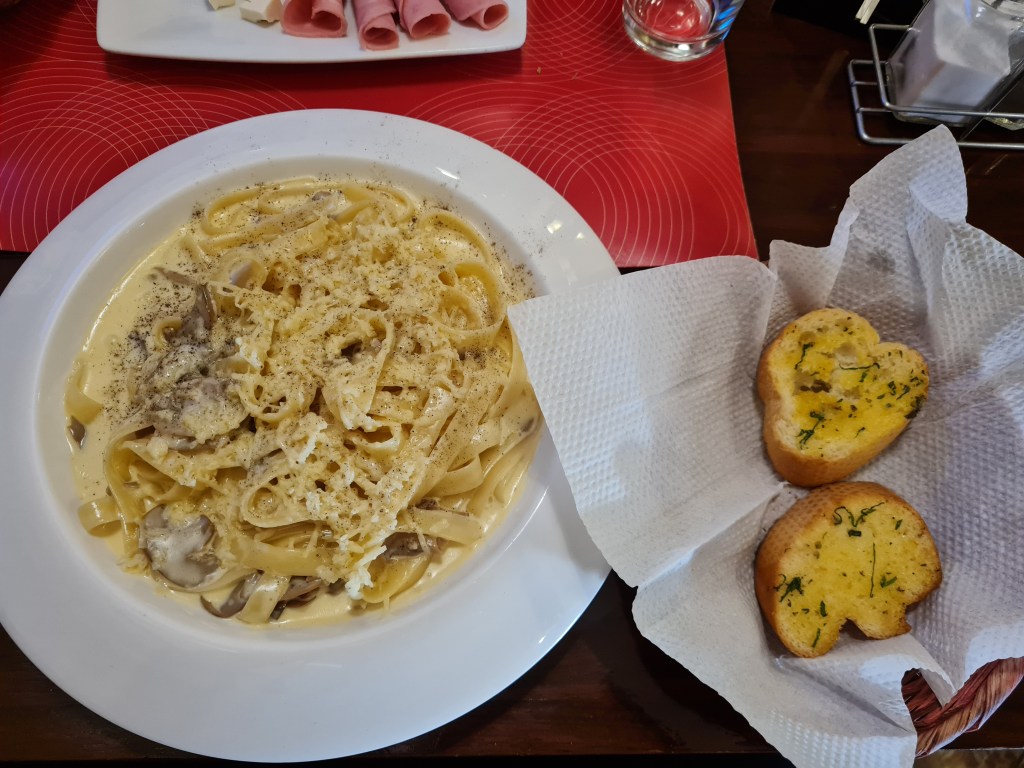 Pegamos nosso querido ônibus 4 e voltamos para o Centro Histórico em busca de um restaurante, o que não foi fácil, pois estava quase tudo fechado, não sei se por causa da siesta que eles fazem ou porque era sábado. Acabamos almoçando no restaurante/ pizzaria Napolitana na Plaza 25 de Mayo. Jaime comeu uma pizza e eu um fettuccini ao molho branco com funghi.