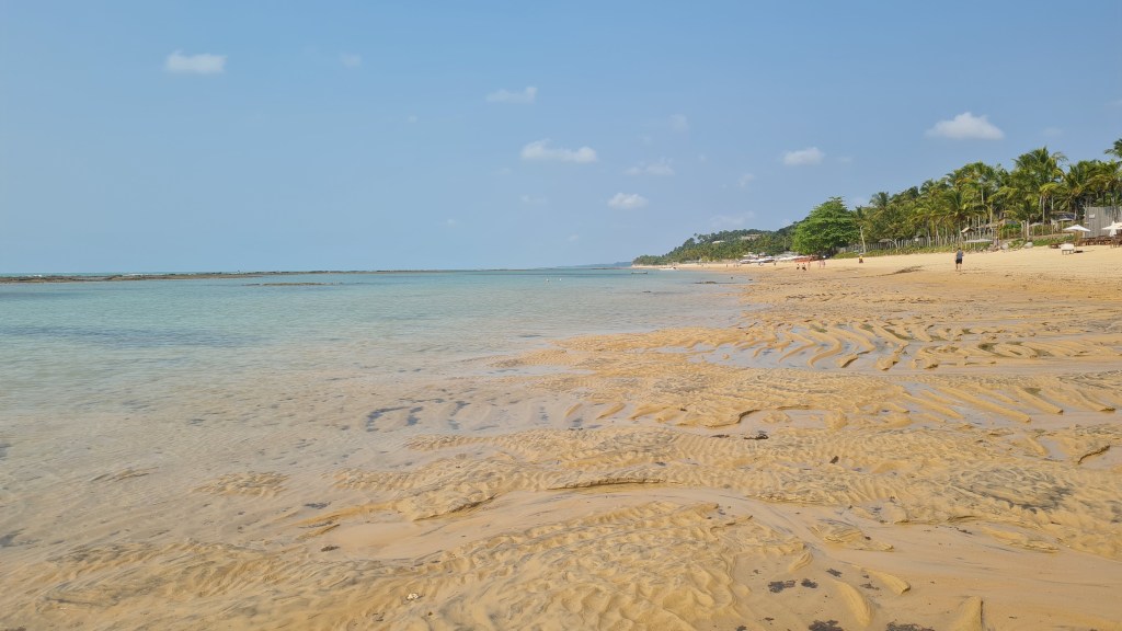 Cheguei à praia por volta das 9h, estava bem vazia e com a maré bem baixinha, perfeito para uma bela caminhada. Fui no sentido da praia de Pitinga.