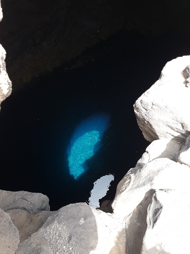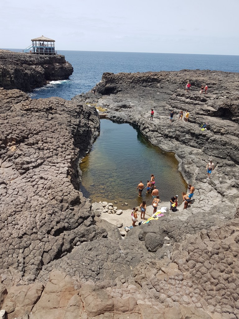 Seguimos para Buracona, que é um local com piscinas naturais e com um buraco que se destaca pelo azul da cor da água que tem dentro dele (Blue Eye – “Olho Azul”). Na parte alta, tem uma bela estrutura com banheiros e um restaurante. Eles cobram €3 pelo banho, que é delicioso!