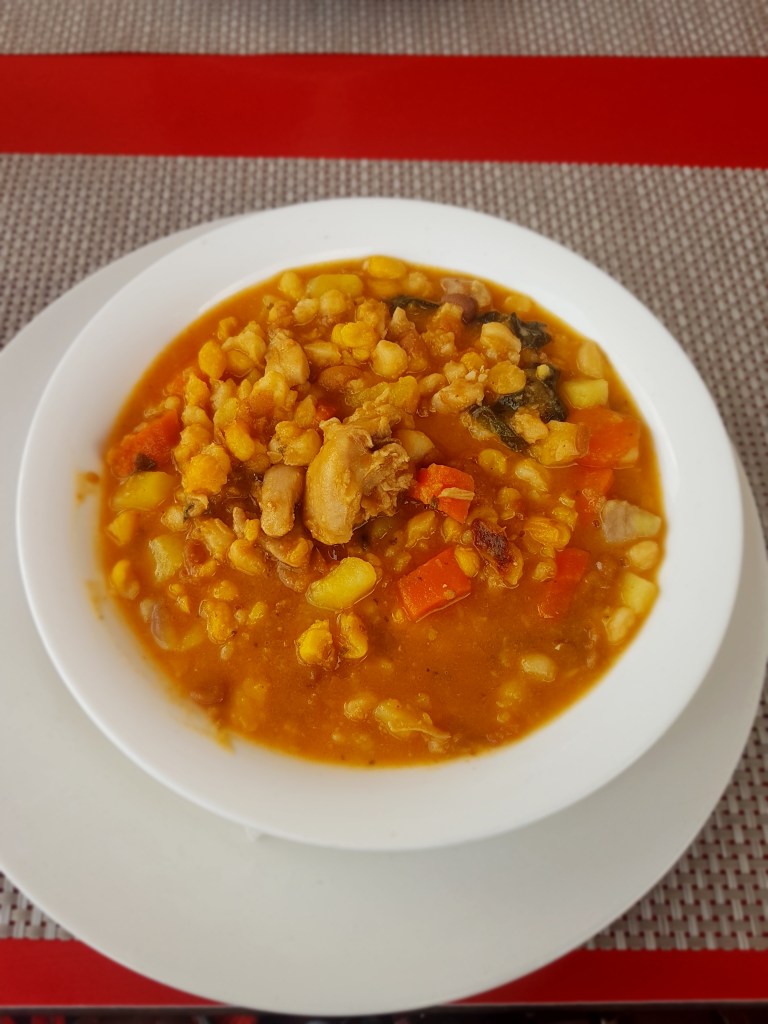 As bebidinhas abriram o apetite. Ainda bem que, logo após, paramos para almoçar em Espargos. Resolvi provar um tradicional prato de Cabo Verde, a cachupa, que leva feijão, milho, frango (pode ser de carne ou de peixe também), mandioca, batata doce, banana da terra, couve, repolho, cenoura, cebola, alho e temperos diversos. Além dela, o menu incluía risole de bacalhau de entrada e queijo de cabra com doce de papaya para sobremesa.