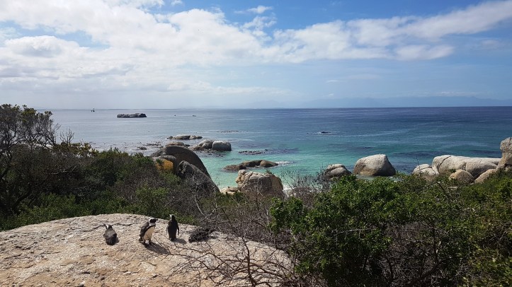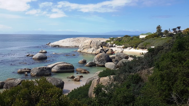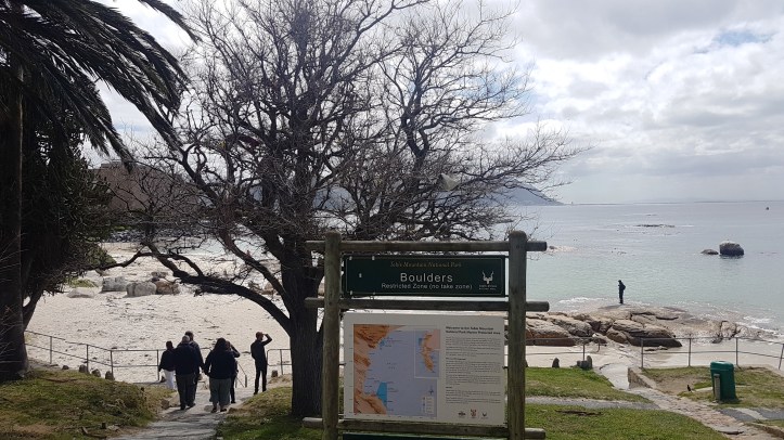 Seguimos pela belíssima estrada, passando por Simons Town e lindas praias, até pararmos em Boulders Beach, praia belíssima repleta de pinguins, que faz parte do Parque Nacional da Table Mountain.