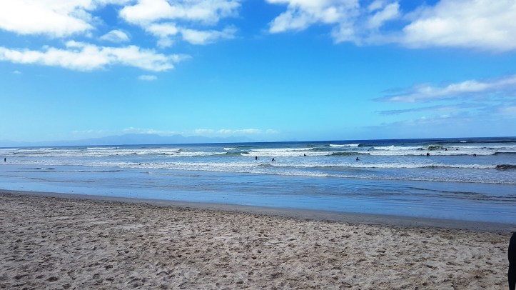 A nossa primeira parada foi na praia Muizenberg, famosa pelas casinhas coloridas na areia. O lugar tem uma vibe bem legal, com aulas de surf e várias lojinhas, além de cafés e restaurantes na orla.