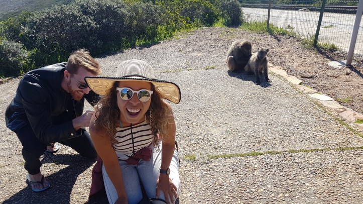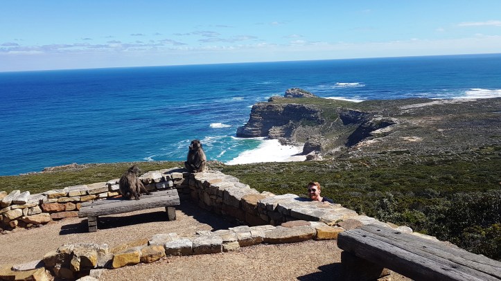 Da parte de baixo, parte uma trilha para o Cabo da Boa Esperança que leva 1,5h ida e volta. Como nosso tempo era curto, preferimos tirar fotos do Cape Point mesmo, pois a caminhada até o mirante era mais rápida. Ah! Descobrimos que os verdadeiros donos do pedaço são os babuínos, uns macacos meio diferentes.