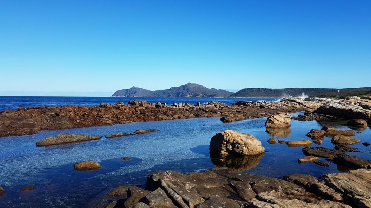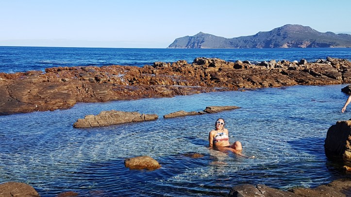 A nossa parada seguinte foi na Venus Pool, na False Bay, uma piscina natural linda formada pela água das ondas. Esse local é bem reservado e não é frequentado por turistas. É bem legal, pois não tem perigo de tubarão. Mas tem que encarar uma trilhazinha no meio do mato.