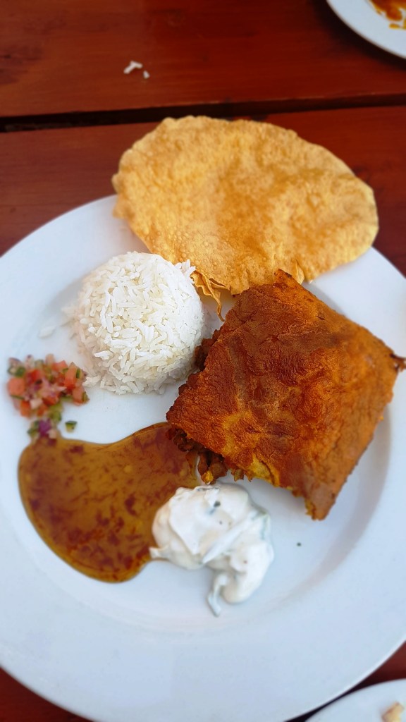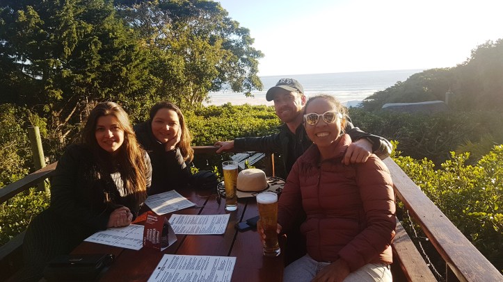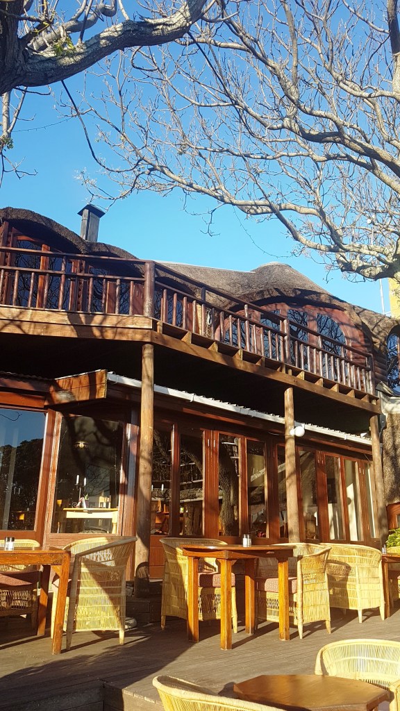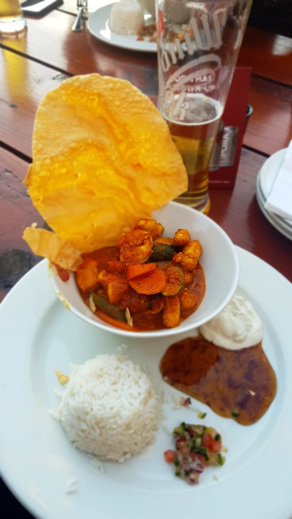 Continuando a volta pela península, já fora do parque, paramos para almoçar no restaurante do Monkey Valley Resort, bastante reservado e com uma vista incrível. Provei o Chicken Curry Cape Malay (frango ao curry com arroz) e o Bobotie (prato típico da África do Sul que lembra um escondidinho de carne moída). Tudo delicioso!