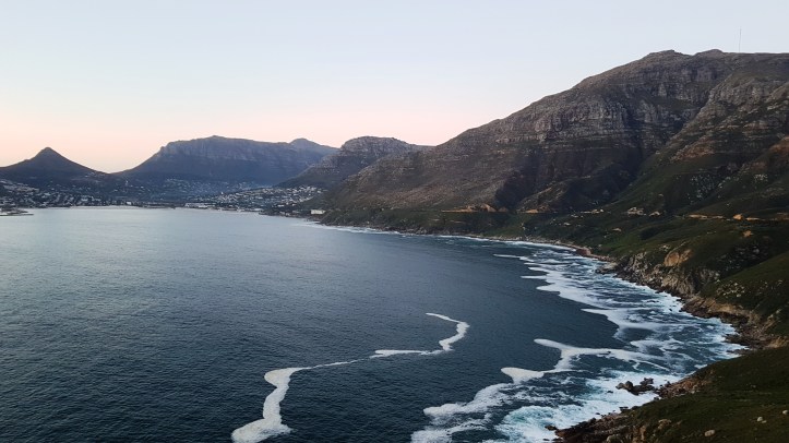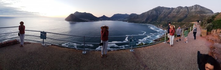 Seguimos para ver o por do sol no Chapman’s Peak Drive. Essa estrada é bastante conhecida na região por ter sido construída nas rochas, o que foi um grande desafio e marco da engenharia. Apesar das nuvens, a paisagem estava linda.