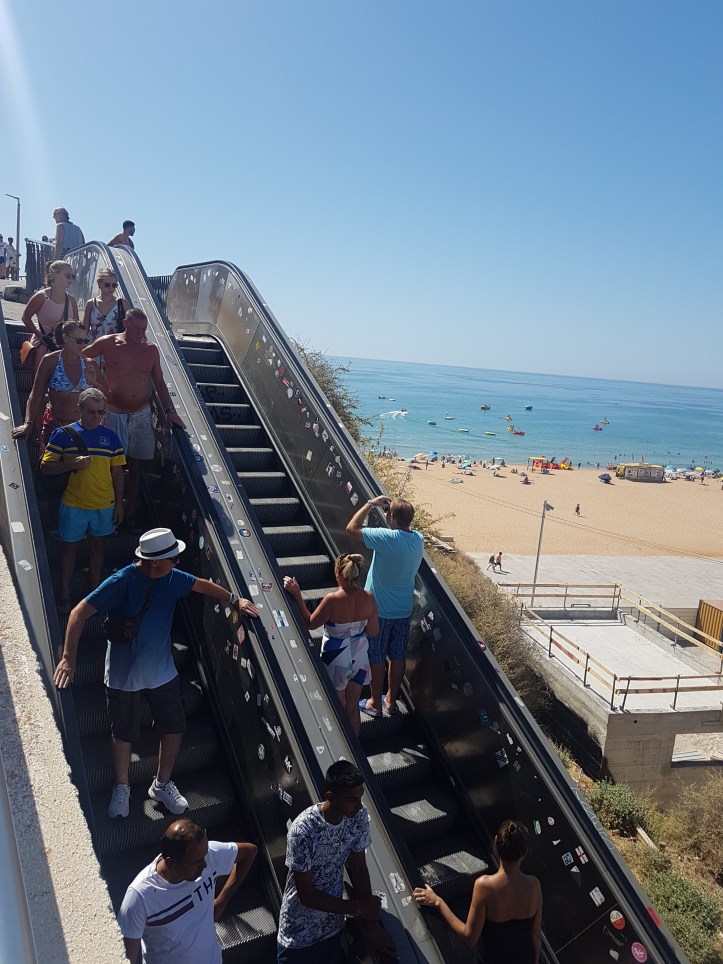 Nossa primeira parada foi na Praia dos Pescadores, bem ampla, com areia dourada repleta de conchinhas (o que pode machucar um pouco o pé), rodeada por formações rochosas (evitar ficar muito perto das falésias, pois tem perigo de deslizamento) e construções branquinhas, formando uma paisagem linda! Ela tem uma estrutura maravilhosa com espreguiçadeiras e barracas na areia e até escadas rolantes para acessar a praia. Fica repleta de pessoas no verão!