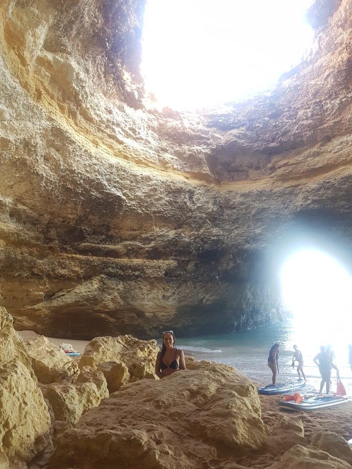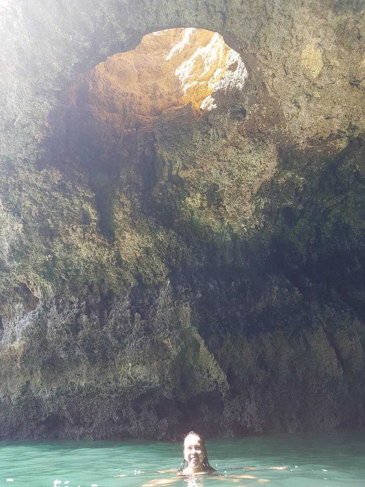 Se a proposta é curtir a gruta com calma, definitivamente, o barco não é a melhor opção. O jeito é ir de caiaque ou de SUP. Escolhi essa última opção (15 euros), pois dava para ir remando com a minha amiga sentada na prancha. Após ter remado por, aproximadamente, dez minutos com várias quedas, pois o mar perto das rochas estava bem agitado e a prancha não era muito estável, entramos na gruta.