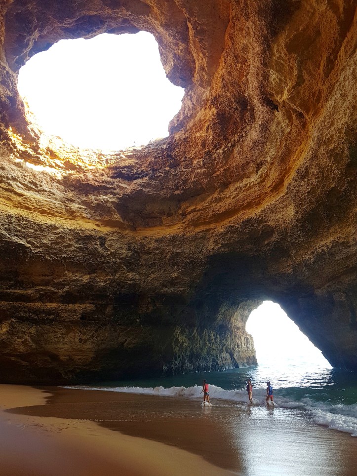 Bem ao lado da praia fica a Gruta Benagil, um dos principais cartões-postais do Algarve, bastante conhecida pela imensa abertura no teto da gruta. Do estacionamento dá para ir caminhando até bem próximo da abertura do teto da gruta (não dá para chegar muito perto por risco de desmoronamento). Mas o bom mesmo é entrar na gruta pelo mar e isso pode ser feito de três formas: de barco, de caiaque e de stand up paddle (SUP). É proibido ir nadando até lá, apesar de a distância ser pequena.