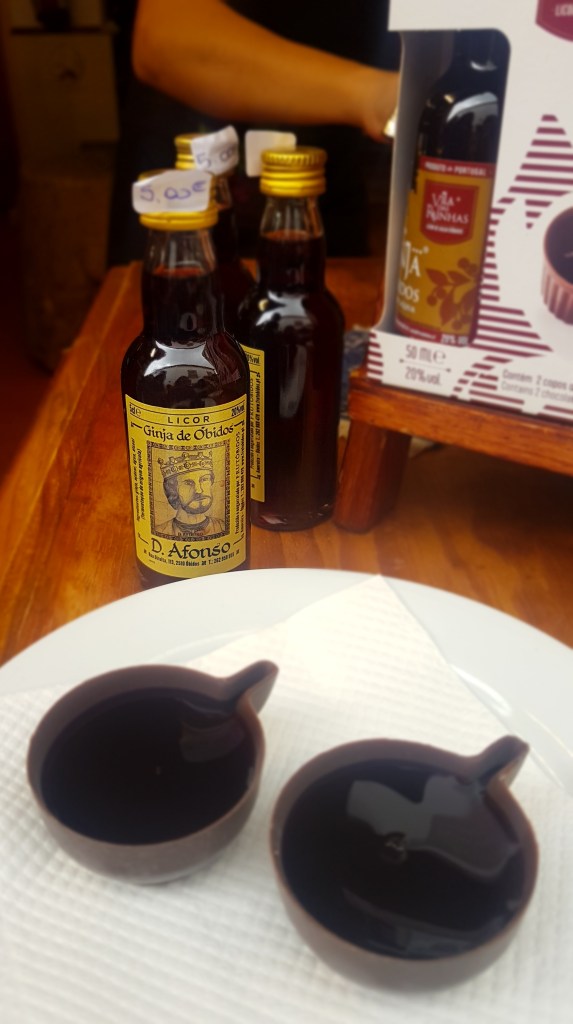 Fizemos um pit stop em uma das várias lojinhas para provar o famoso licor de ginja no copo de chocolate. A ginja é um tipo de cereja e é meio amarga, mas o licor é bem doce.