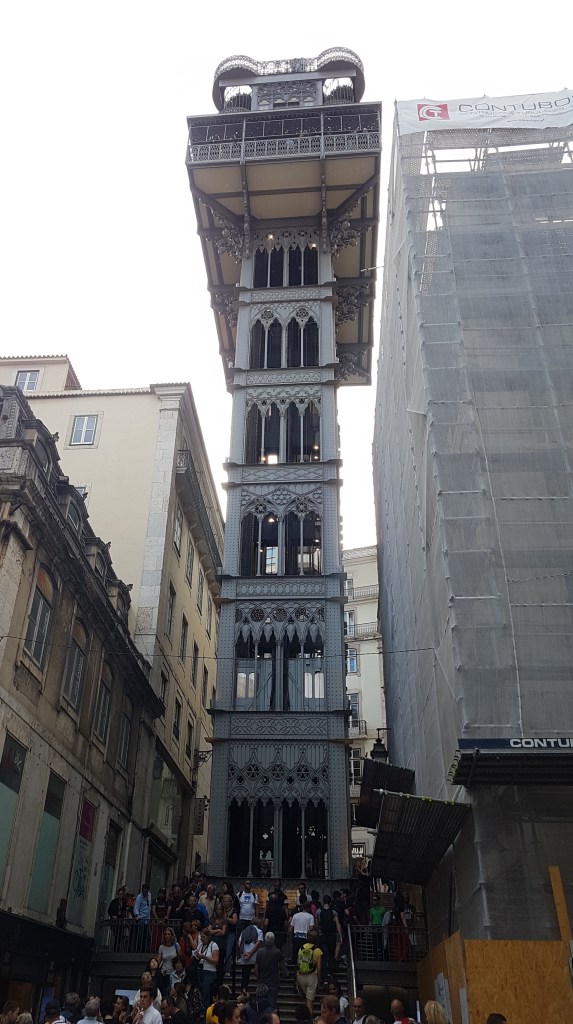 Começamos pelo Elevador de Santa Justa, que achei belíssimo, por sinal! Não somente uma atração turística, mas também uma opção de transporte para ligar as partes alta e baixa da cidade.