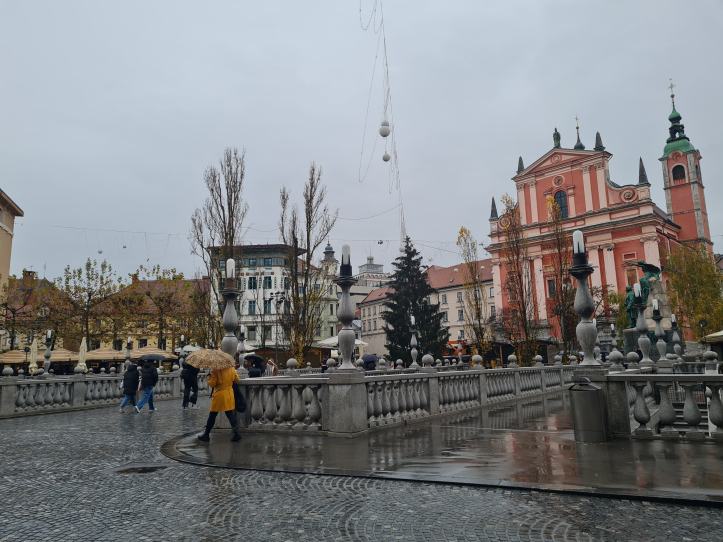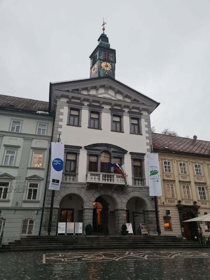 Nossa entrada na Eslovênia (brasileiros não precisam de visto) foi pelo Aeroporto Internacional de Liubliana, de onde pegamos o shuttle (van porta a porta – €12 cada) para nosso airbnb no centro da cidade. Lá fomos recebidas pelo nosso anfitrião, Dejan, um esloveno super gentil e que nos deu várias dicas legais sobre o que visitar. A localização da nossa acomodação era maravilhosa, ao lado da Prefeitura e quase em frente à Catedral Saint Nicholas, cujas cúpulas verdes podem ser vistas de vários pontos da cidade.