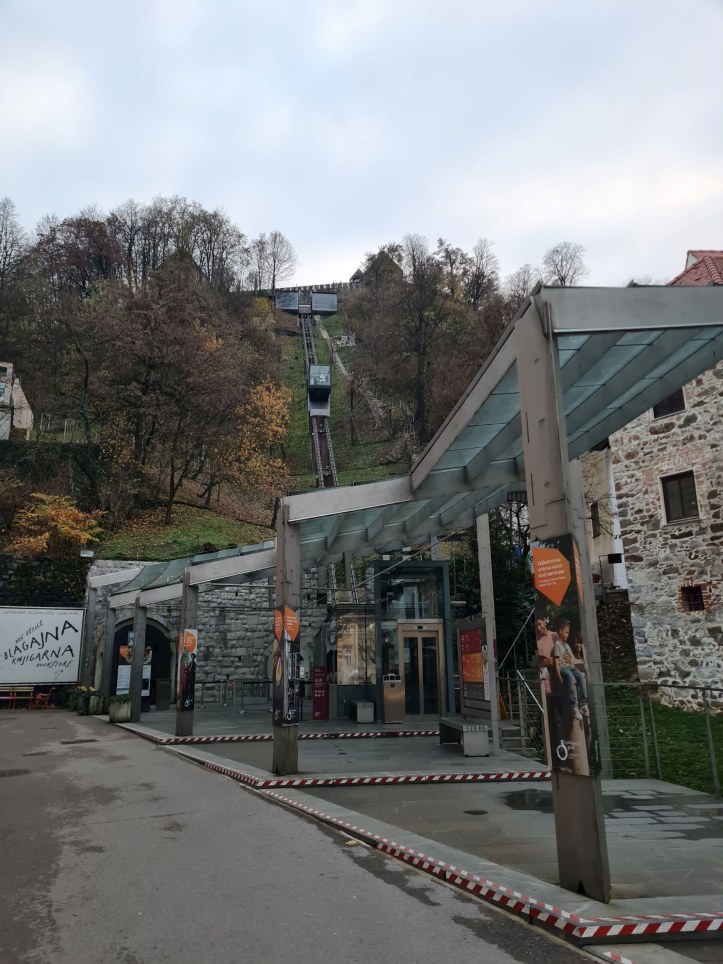 No dia seguinte, fomos conhecer a famosa caverna de Postojna, distante cerca de 50km da capital, passeio que será detalhado em outro post. Voltamos no fim do dia, e caminhamos da Rodoviária em direção ao funicular (€3.3 ida ou €6 ida e volta) que leva ao alto do morro onde fica o Castelo de Liubliana, passando pela Ponte dos Dragões.