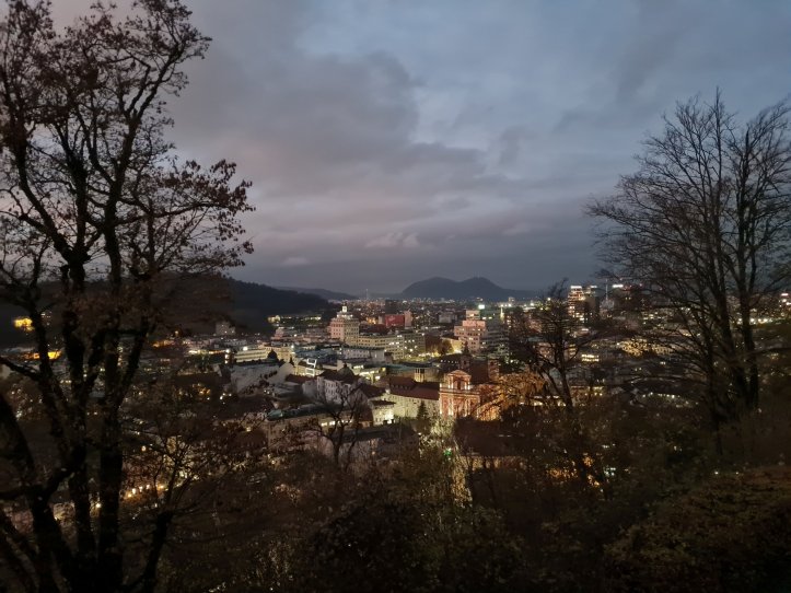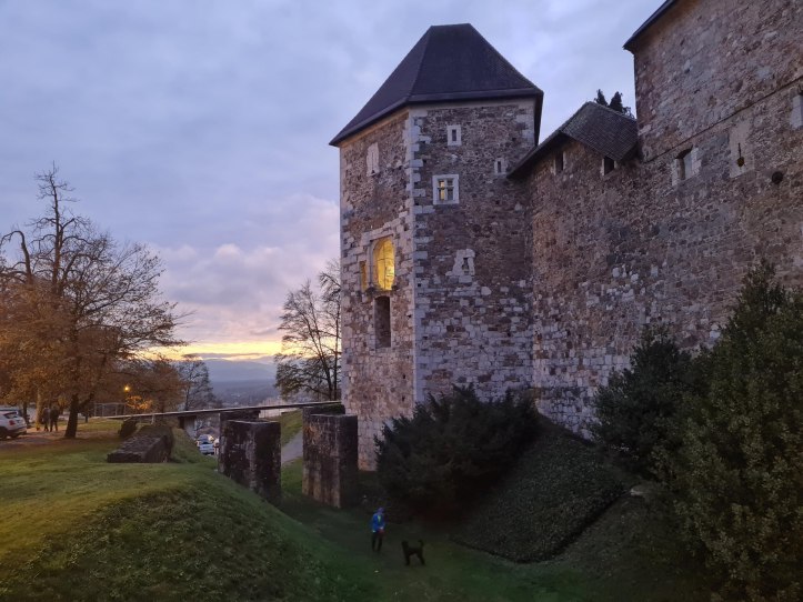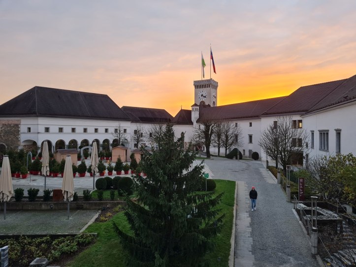 O Castelo de Liubliana, já foi reconstruído algumas vezes e foi utilizado para fins diversos, como hospital, prisão e armazém. Atualmente, sedia algumas exposições. A entrada custava €12 ou €16 com o funicular (ida e volta). Achamos que não valia a pena entrar na parte paga do castelo, já que a parte gratuita já era bem interessante, pois incluía acesso a um mirante elevado, a um pátio central, a uns espaços com exposições e também dava para andar pelo entorno da muralha com uma vista maravilhosa da cidade. Optamos por descer caminhando por uma das 7 trilhas e já saímos pertinho do centrinho histórico.