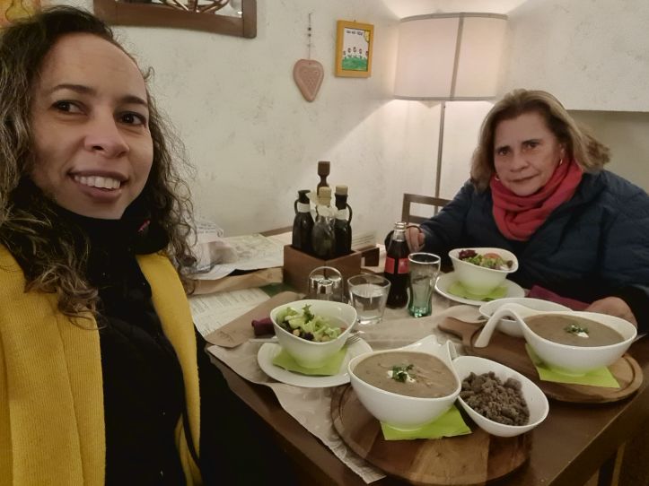 Seguimos pela via principal (Ciril-Metodov Trg), olhando as lojinhas, passando, inclusive, pelo belíssimo prédio da Prefeitura, até chegar ao restaurante que escolhemos para almoçar: o Druga Violina. Ele foi um dos que nosso anfitrião indicou para provar comida local. Pedimos uma sopa de cogumelos com dumplings (mas veio carne moída) que veio acompanhada de salada (€7,2). Estava gostosa e muito bem servida! O restaurante tinha garçonetes com deficiência, o que achei bem legal!