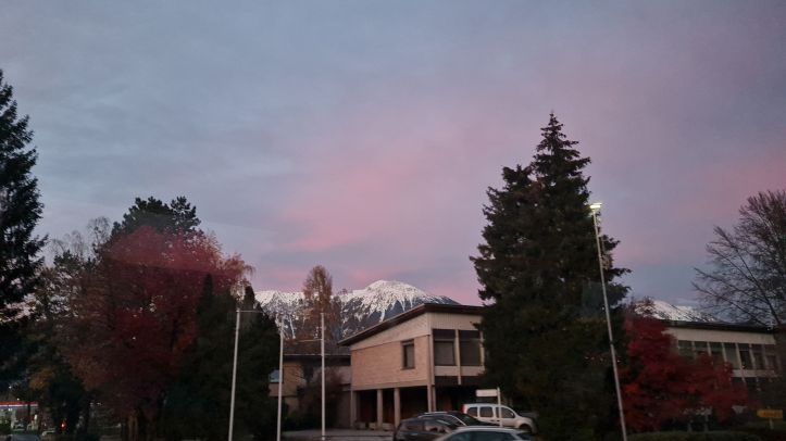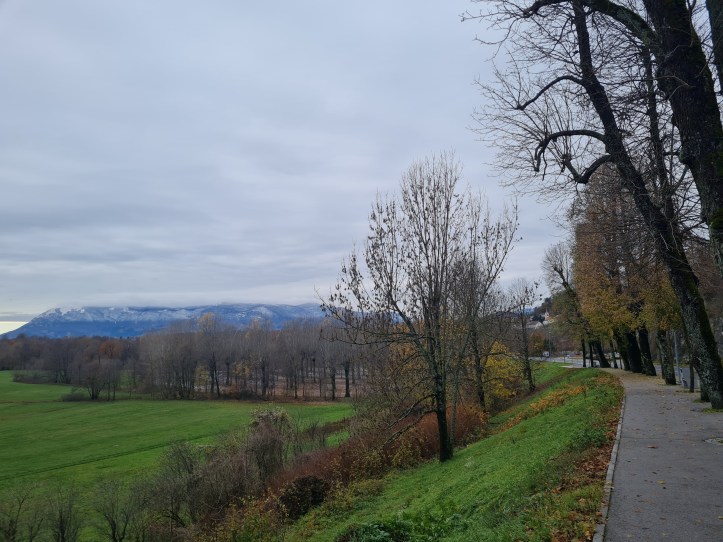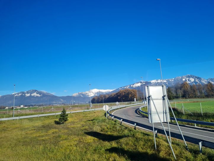 Pegamos o ônibus (€11.68 ida e volta) na rodoviária de Liubliana e seguimos pela estrada que tem uma vista linda, com montanhas com o topo repleto de neve.