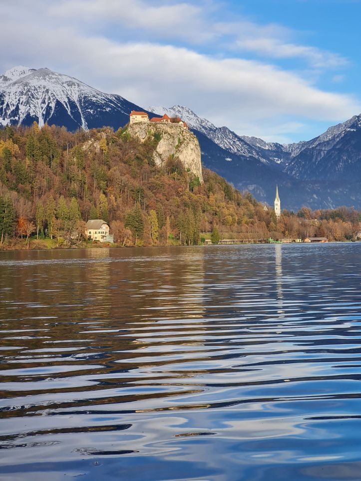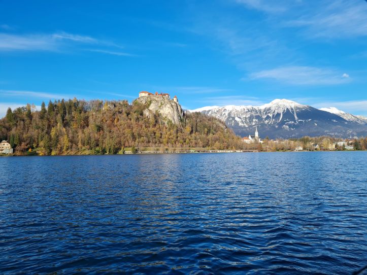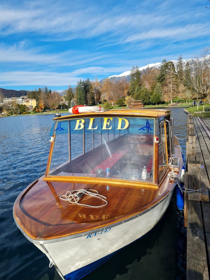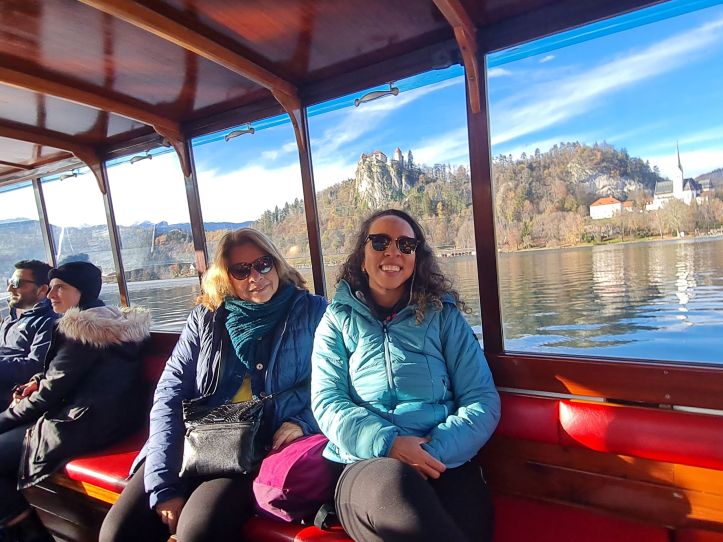 Continuamos nossa descida até chegarmos ao ponto de partida (perto dos hotéis e do Centro de Informações Turísticas) do barquinho para a Ilha de Bled. Fomos no barquinho elétrico (€12 ida e volta), que sai de hora em hora. Tem outro mais tradicional (remo) que, além de ser mais caro, sai com menos frequência na baixa temporada, pois precisa de uma quantidade mínima de pessoas para sair. O passeio é bem tranquilo e proporciona uma vista incrível.