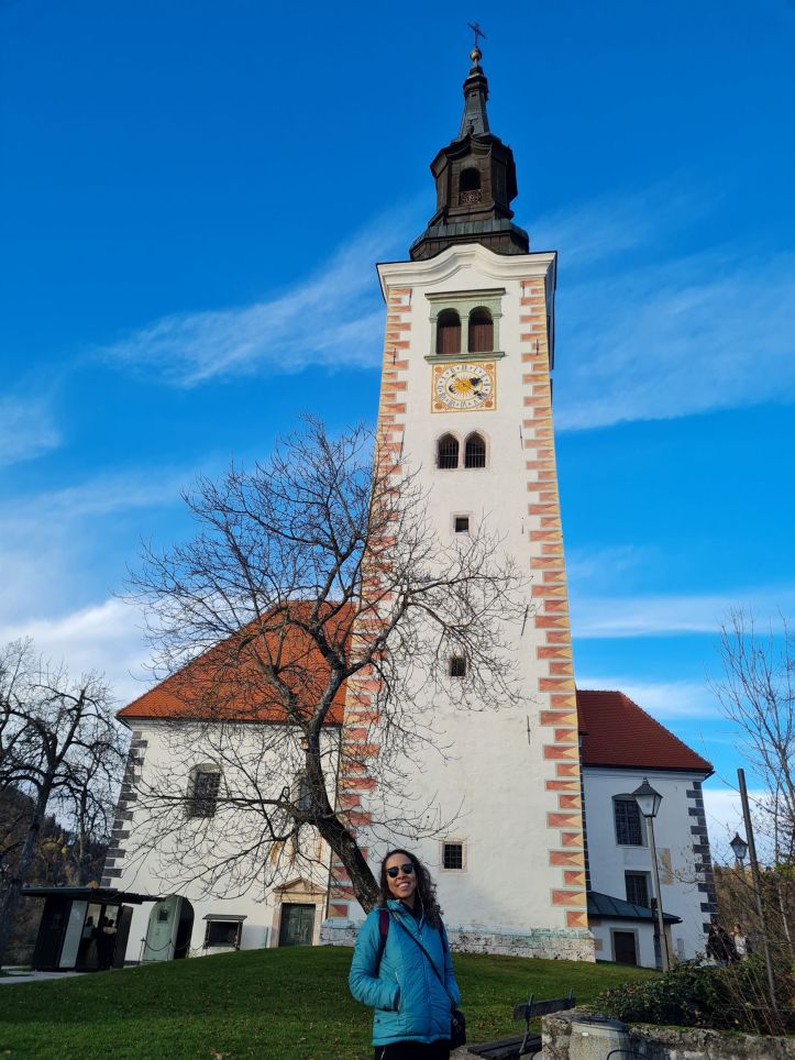 Chegando à Ilha, nos dão uma hora para ficar por lá, pois ela é minúscula. A única atração é a Igreja da Assunção da Bem-Aventurada Virgem Maria com sua torre sineira. Dizem que dá sorte subir os 99 degraus e tocar o sino 3 vezes. O custo disso é €12. Optamos por percorrer a ilha e aproveitar o visual que é maravilhoso. Tem ainda uma lojinha de souvenir, uma sorveteria e um café. No verão, para os mais dispostos, dá para ir nadando, de SUP, caiaque…