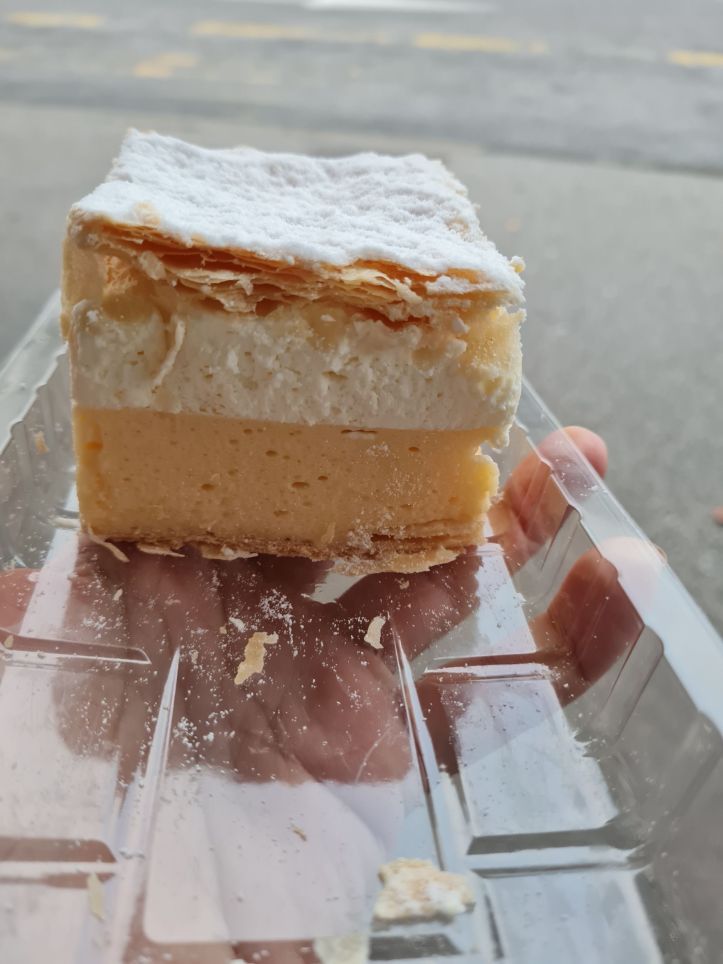Antes de pegarmos nosso ônibus de volta para Liubliana, paramos para provar o famoso bolinho de Bled (Kremšnita), que é bem gostoso e molhadinho. Ele tem três camadas: creme de baunilha, chantili e massa folheada.
