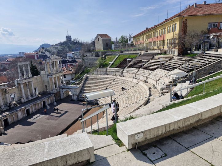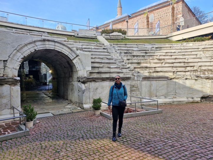 A última parada do tour foi no Antigo Teatro Romano (Ancient Theatre of Philippopolis), que é um dos monumentos mais bem preservados da era romana nos Bálcãs e um dos símbolos da cidade. Construído no final do século I d.C., o teatro tinha capacidade para cerca de 7 mil espectadores e era usado para peças, concertos e reuniões públicas. Localizado entre duas colinas, oferece uma vista espetacular da cidade moderna e do vale do rio Maritsa. Redescoberto nos anos 1970 após escavações arqueológicas (dizem que foi após um morador encontrar um pedaço de escultura de mármore ao cavar no seu jardim), o teatro foi restaurado e hoje recebe apresentações culturais e festivais.