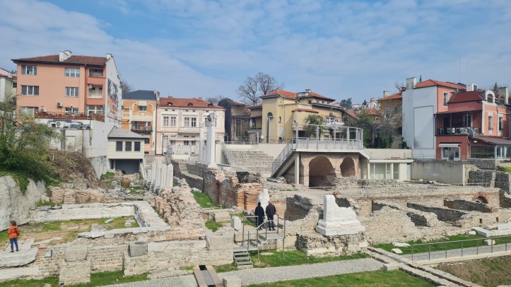 Começamos o passeio pelo Foro Romano Philippopolis, que fica logo após o Parque “Tsar Simeon Garden”. Ele é um dos maiores complexos arqueológicos da Bulgária. Foi construído no século I d.C., ocupando uma área de aproximadamente 20 hectares. Era o coração da vida pública, administrativa, comercial e religiosa da antiga Philippopolis. As escavações iniciadas em 1971 revelaram a grandiosidade do espaço e hoje os visitantes podem caminhar entre as ruínas de colunas, edifícios administrativos e praças.