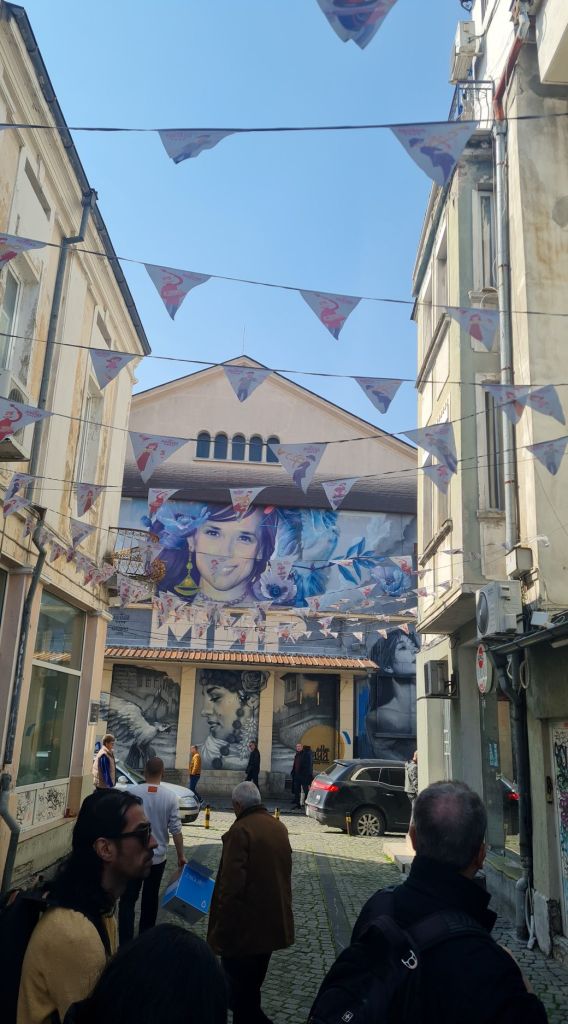 No caminho para a Cidade Velha (Old Town), passamos pelo Bairro de Kapana, um dos lugares mais vibrantes e criativos da cidade, perfeito para quem gosta de arte, gastronomia e vida boêmia. É um verdadeiro labirinto com cafés charmosos, bares alternativos, galerias de arte e lojas de design. Segundo o guia, antes era uma importante região comercial, mas foi atingida por um grande incêndio no início do sec XX. Foi reconstruída depois disso pelos comerciantes. Durante o regime comunista (entre 1946 e 1990), a área ficou abandonada e predominava a cor cinza nas construções. Após um processo de revitalização, Kapana tornou-se o epicentro cultural de Plovdiv, especialmente durante o período em que a cidade foi Capital Europeia da Cultura. Foram dados incentivos para atrair os comerciantes de volta e o grafite levou o colorido e vida para o bairro.