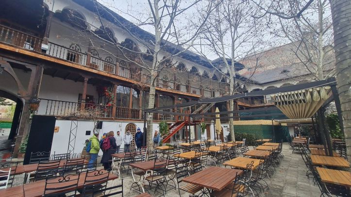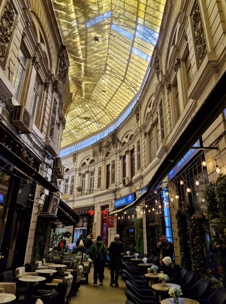 Um dos lugares mais agradáveis que visitamos foi a Passagem Macca-Vilacrosse, um dos cantinhos mais charmosos de Bucareste, localizada entre a Calea Victoriei e a rua Lipscani, no centro histórico. Construída no final do século XIX, ela se destaca pela cobertura de vidro em formato de “Y”, que permite a entrada de luz natural e cria uma atmosfera acolhedora. Originalmente projetada para abrigar lojas e cafés elegantes, hoje continua sendo um ponto de encontro vibrante, repleto de bares, restaurantes e espaços culturais. Segundo a guia, o dono dividiu a passagem entre suas duas filhas e deu o nome dos seus genros.