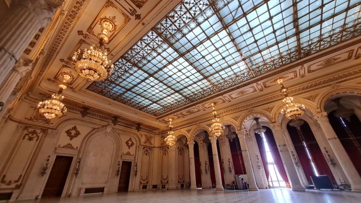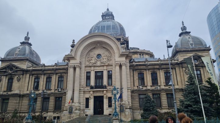 Caminhamos mais um pouco e chegamos ao Palácio CEC, um dos edifícios mais icônicos de Bucareste, situado na Calea Victoriei, uma das principais avenidas da cidade, onde os ricos desfilavam suas riquezas no século XIX. Inaugurado em 1900, foi projetado e construído para abrigar a sede do Banco de Poupança CEC (Casa de Economii și Consemnațiuni) e hoje é a sede do CEC Bank. Sua arquitetura em estilo eclético impressiona pela fachada ornamentada e pela imponente cúpula de vidro e metal que cobre o hall central.