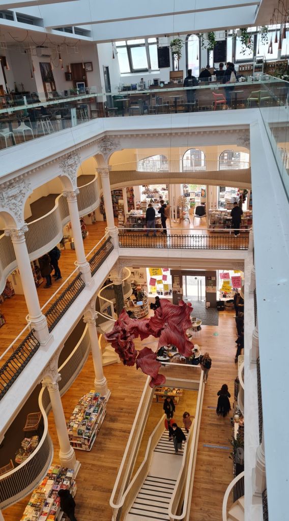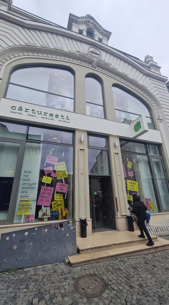 Após poucos minutos de caminhada, chegamos à Cărturești Carusel, livraria considerada uma das mais belas do mundo. Instalada em um edifício histórico do século XIX, que já foi sede bancária, o espaço foi totalmente restaurado e transformado em um ambiente moderno e luminoso, com seis andares repletos de estantes, varandas e escadarias elegantes. Além da vasta seleção de livros, o local oferece vinhos, produtos artesanais e presentes, e uma cafeteria no último andar, tornando-se um verdadeiro centro cultural.
