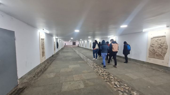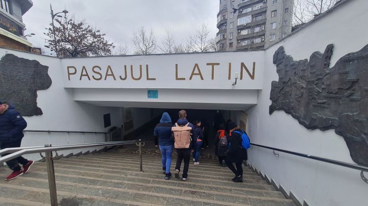 A parada seguinte ficava ali perto, mas do outro lado de uma movimentada avenida (Boulevard Brătianu). Atravessamos por uma passagem subterrânea conhecida como Passagem Latina. Ela foi construída entre o final dos anos 1960 e início dos anos 1970, como parte das obras de modernização urbana que acompanharam a abertura do atual Boulevard Brătianu. Ao longo da passagem, é possível admirar obras de arte afixadas nas paredes.